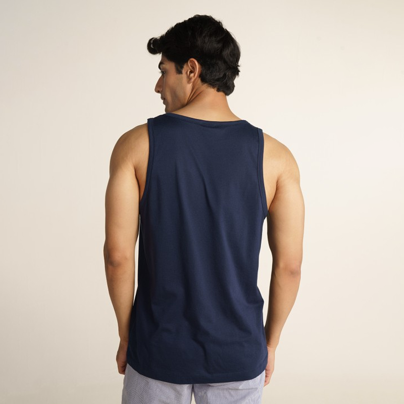 Navy blue lounge Tshirt for menSolidRegular lengthRound neckSleevelessSize & FitRegular FitThe model (height 6') is wearing a size MMaterial & CareCotton Blend.Machine Wash