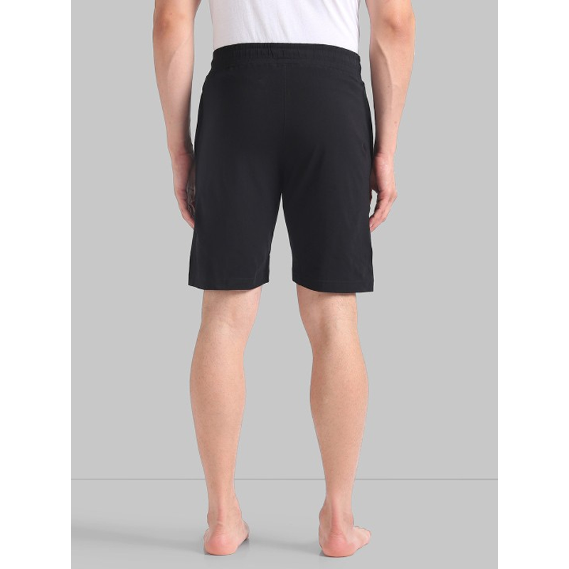 Black solid mid-rise above knee length regular shorts, has 2 pockets and has elasticated waistband with slip-on closure